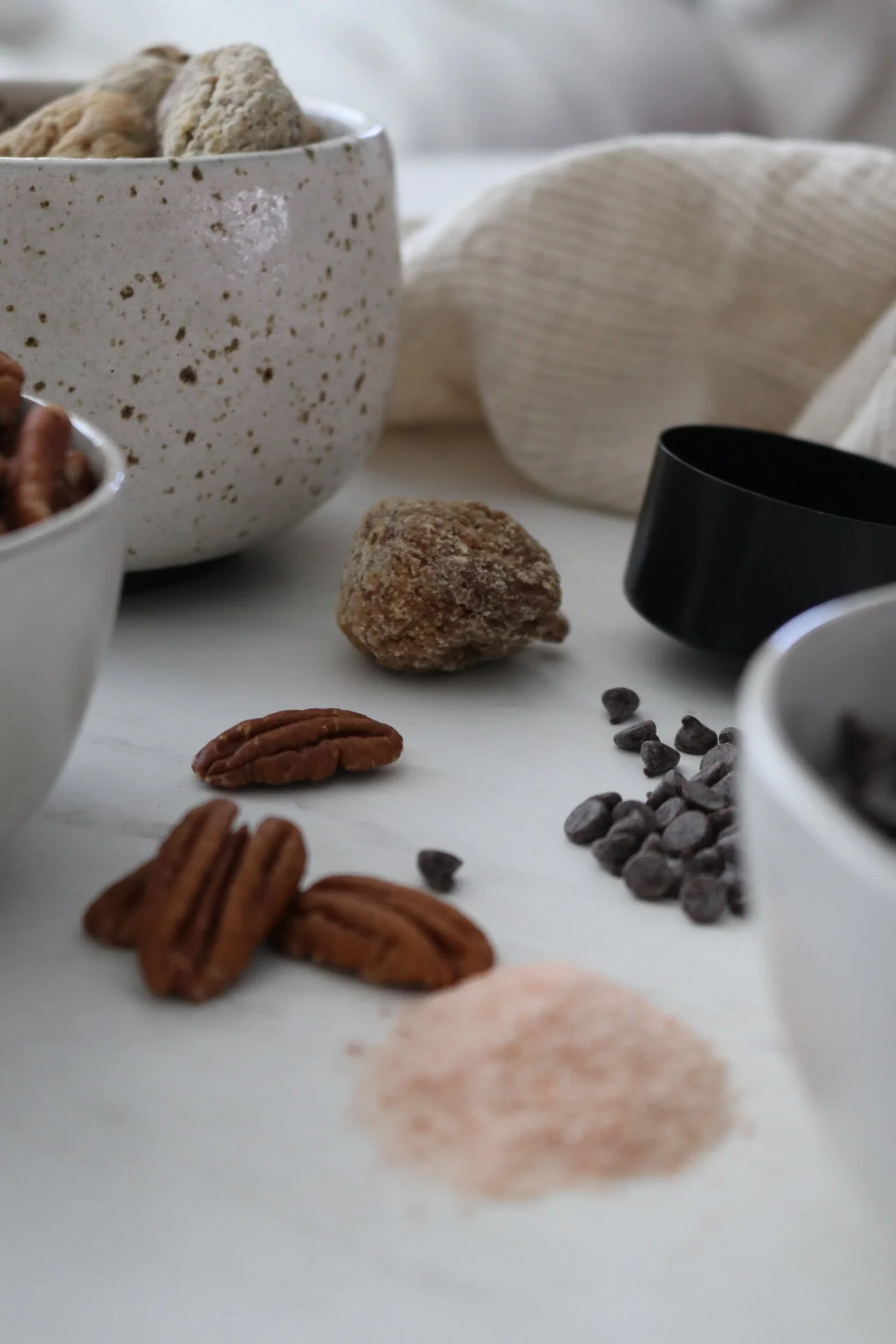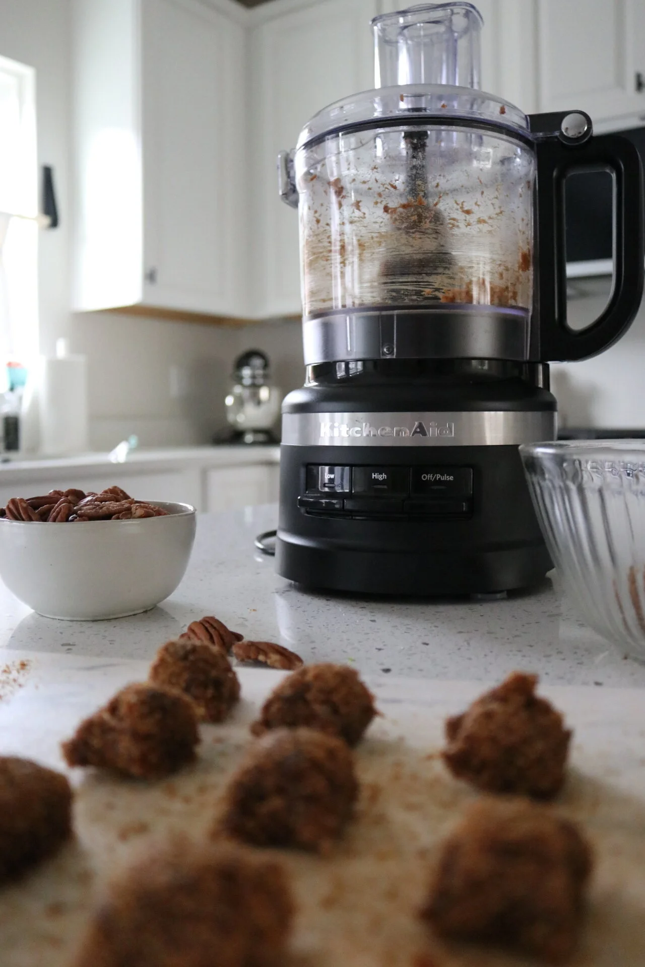 Start by putting all your dates (or figs) into your food processor and add your Himalayan salt. Process on low. After the dates begin to break up bring the speed up to high and process until all the dates turn into a ball.