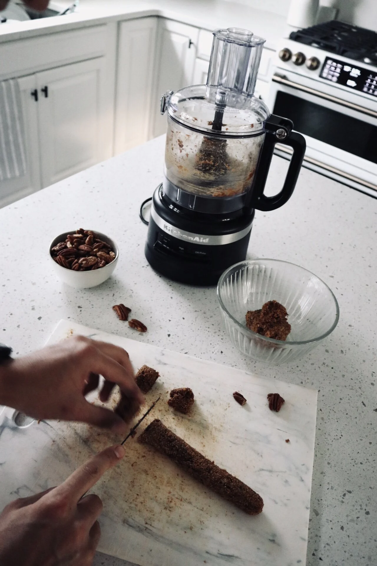Then, remove date ball from processor and split into two. Take each half and roll into a 1-1.5” log on your parchment paper.