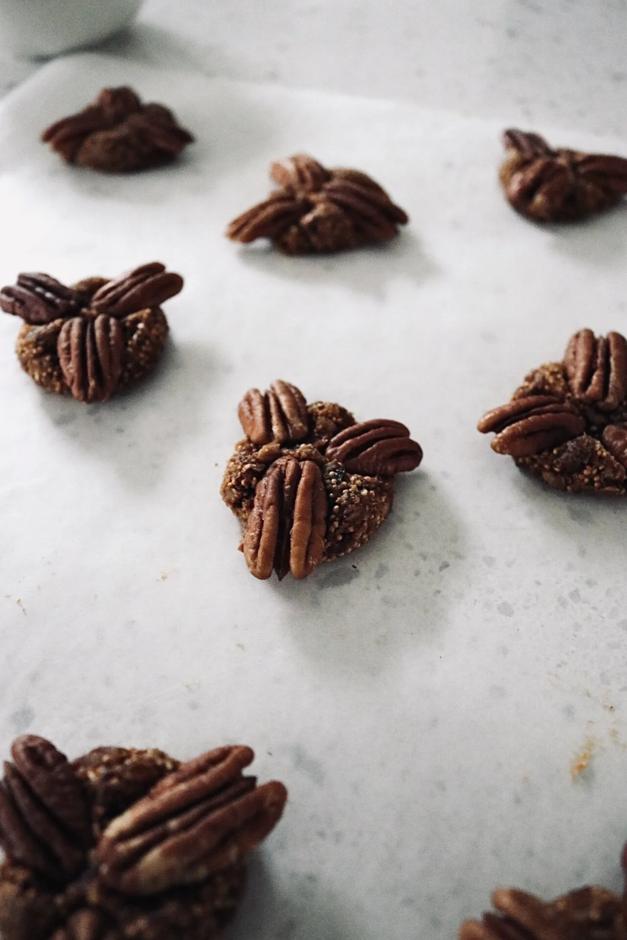 Cut the roll into 1/2” pieces, set them on your cookie sheet, and press three pecan halves into the disks angling them outwards from the center (like a peace sign)!