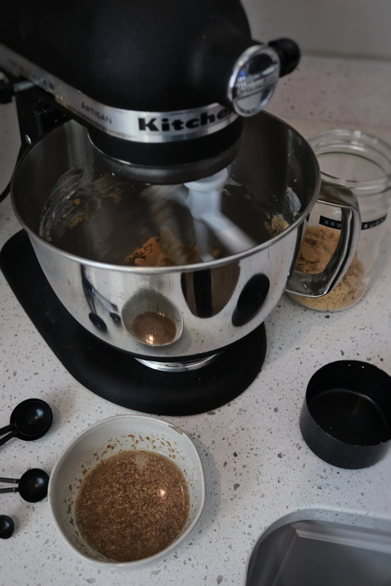 In a stand mixer, with a paddle attachment, or with a handheld mixer, mix the softened vegan butter and brown sugar until creamy (2-5mins), add in the vanilla and flax egg and mix until combined (1min).